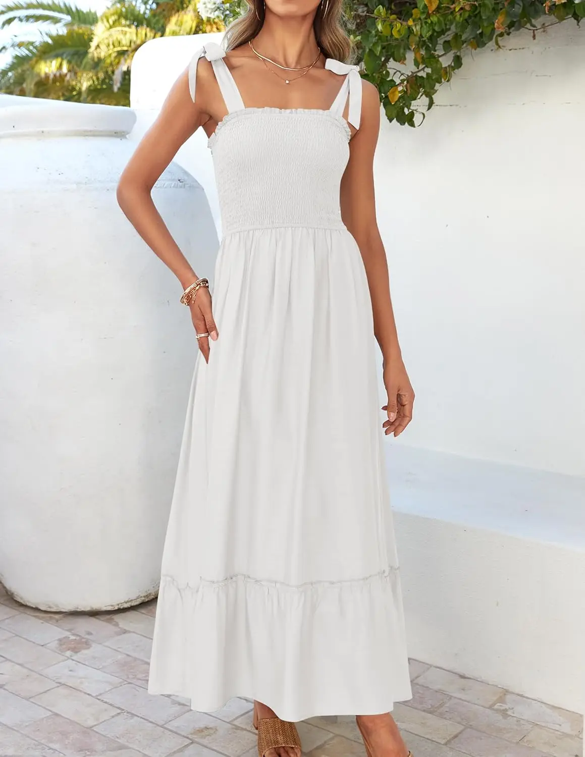 Women's 2025 Summer Bohemian Maxi Dress Casual Square Neck Spaghetti Strap Solid Color Ruffle A-Line Natural Waist Beach Long